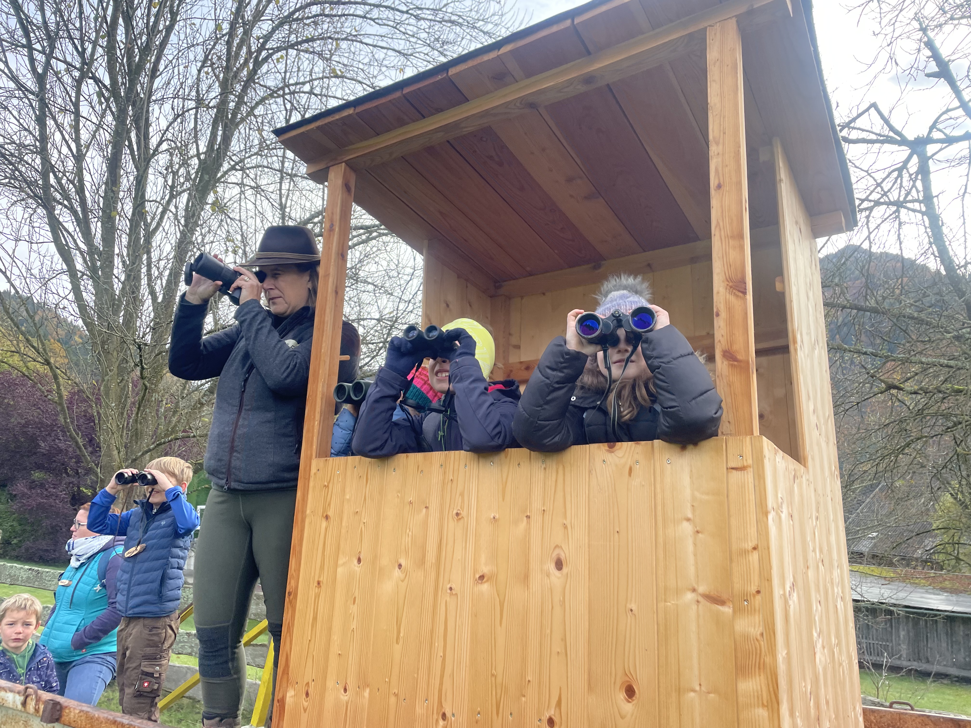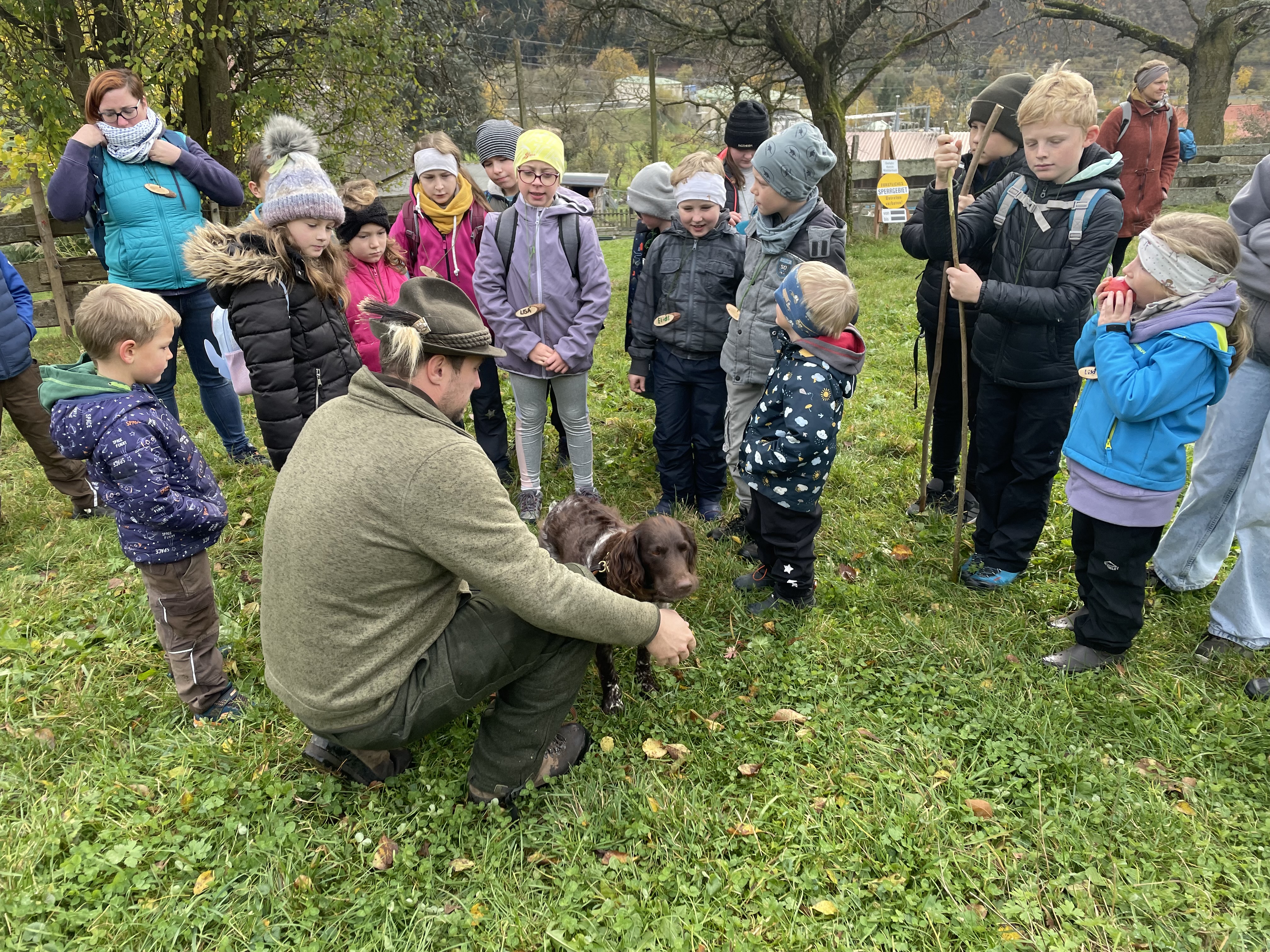 Gabi Prietl hatte Namensschilder aus Holz und für zwischendurch eine gesunde Jause vorbereitet. Nach der Begrüßung durch Ortsstellenleiter Pabst wurde in zwei Gruppen eingeteilt, die von den beiden Wald-und Jagdpädagogen Isabella Reisinger und Andreas Herdy übernommen wurden. Nun galt es für die jungen Teilnehmer viel Neues zu enddecken. Ganz spannend, was ist in einem Jägerrucksack? Wozu braucht man das? Welche Tiere leben in unserem Wald und welche Ansprüche haben sie an ihren Lebensraum? Wie verhält man sich in der Natur ohne zu stören? Spielerisch wurde den Kindern die Sinne für Hören und Sehen durch Anschleich- und Suchspiele geschärft. Auf die Gefahren bei der Holzernte für Waldbesucher wurde an Hand einer Sperrgebietstafel hingewiesen.